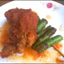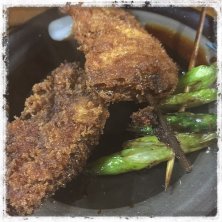 こちらは牡蠣とアスパラ♪ 辛いソースです!うまーい♪