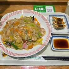 リンガーハット 横浜ノースポートモール店の長崎皿うどん¥900+ぎょうざ(3個)¥0(クーポン)。 久しぶりの皿うどん。今日のは餡がやや強めだったけど、後半でいい塩梅に麺に纏うね。