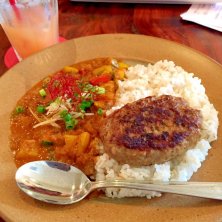 野菜マサラカレー、ハンバーグ乗せ。辛かった