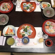 お夕飯 皐月御献立 食前酒 梅酒カクテル 先付 造り 季節のお造り 口代り 五点盛り 台物 焼きタラバ蟹 レモン カニ酢 鯛の兜煮 牛蒡 髭ネギ 木の芽 煮物 中皿 牛ステーキ 茶碗蒸し 等