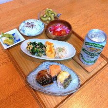 休日、奥さんとおウチ晩ごはん…。 ・鮭🐠サワラ🦈さば🐟 ・玉子焼き🥚おから🥕 ・大根🥒の葉玉子🥚 ・トマト🍅サラダ🥗 ・白菜🥬浅漬 ・キウイ🥝🥝🥝 そして… ・ビーーーーーール🍺 お疲れさまでしたーーーーー✨