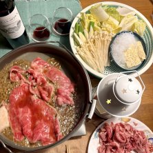 【すき焼き】 土曜日のおうちディナーは 三が日に妻の実家から頂いてきた福壽館のお肉で すき焼きにしました🥩 そしてワインは 長年キープしておいたちょっといいフランス産🇫🇷のカベルネ・ソーヴィニヨンを開けました🍷 最高に美味しいマリアージュでした😋