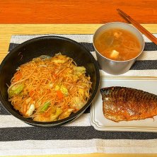 こんばんは 夜ご飯です 今夜は塩焼きそば、サバ様、レンチンした味噌汁の残り 今日まいばすで麻婆丼を買った時、生の塩鯖が30%引だったので買っておいた フライパンで焼いたら脂がたくさん出たのでその脂で焼きそばを作った サバ様に包丁で切れ目を入れたけど、包丁から伝わるあのグニュっとした感じが全身がブルっとなるくらい苦手 明日はお休み! 大掃除して、後はマックのグラコロ食べたい