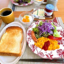 1/12 朝ごはん♪ *ホットコーヒー コモドドラゴンブレンド *トースト セルフトッピング スライスチーズ、いちごスプレッド *スクランブルエッグ、ソーセージ、 パプリカソテー、サラダ *みかん蜂蜜豆乳ヨーグルト 目覚ましかけずに寝て、ふと目覚めたらゴミ出しギリギリの時間!あわてて寝室から出る時、ドアまだ開けきってなかったのに出ようとして肩を思い切りぶつけた🤣心と体が別行動〜笑 なんとか間に合った💨 トーストはドンクのハードパン🍞珈琲もそのまま飲めるようになった!