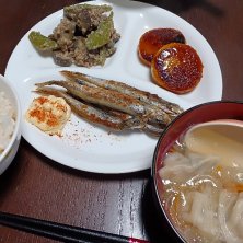 2026年1月12日(月曜) 夕飯 ししゃも かぼちゃ団子 ナス味噌炒め 水餃子 ご飯 地味に水餃子食べるの初めてな気がする〜! ししゃもメインの夜ご飯はちょっと寂しい気持ちに…😰 水餃子だけでメイン?ししゃもだけでメイン?で悩んだから、メインかもしれない2つをコラボにしてみました😅