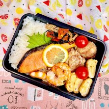 夫の『試合弁当』です🏀 ❄️焼き鮭 ❄️唐揚げ ❄️卵焼き ❄️ポテサラon海老のマヨソテー🦐 ❄️ヒジキの甘辛炒め ❄️🍅 緑がないお弁当😓 時間もないし、気がつかなかった事にしてフタしちゃいました😆
