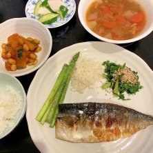 晩ごはん 塩鯖 ミネストローネ 残り物 かぼちゃと大豆の煮物 きゅうりと蕪の浅漬け 春菊の胡麻和え アスパラ エコさんのマネをしてかぼちゃと大豆の煮物✨ ほっこりした煮物が食べたかったので美味しすぎたー☺️ ここにはグリルがないので魚は焼けないと思ってましたが、初めてフライパンで焼いてみた〜 上手く焼けて感激😆 大根おろし器がなかったので、大根を刻んでみたけど食べにくい😂 100均でも買えるけど、今は意地でも物は増やしたくないからねー、何か裏技ないかな😅