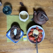 おはようございます 雨上がり待ち⛈️🌧️🌨️ 初結露!拭いたほうが良いと思うけど。。 嬉野🍵 蜂蜜🍯 きな粉✨ チーズ🧀 ヨーグルト✨ サンロード🍅 exv🫒&亜麻仁油🥥 マンハッタン ノーマル🍩