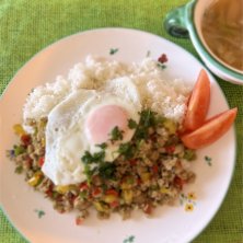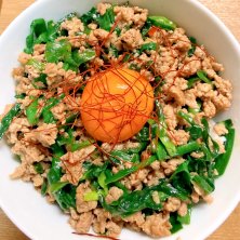 ニラと豚ひき肉のピリ辛丼 ピリ辛でご飯が進みます😋