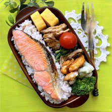 お鮭さーん✧*。٩(ˊᗜˋ*)و✧*。. ☆焼き鮭さん ☆チーズ入り玉子焼きコンポタ味 ☆豚肉とろりん焼き ☆ほうれん草炒め ☆トゥメェイトゥ ☆しめじマヨソース ☆蓮根天と枝豆天 ☆ブロッコリー 金曜日!