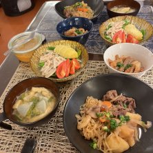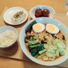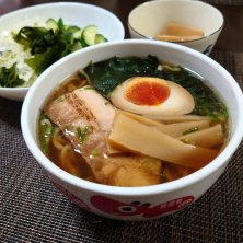 ノンアル晩飯(ダンナも私も麺。) 🔹喜多方ラーメン(河京) 🔹ワカメ野菜サラダ この喜多方ラーメン… かなり旨いのですよ〜💓 何度かお取り寄せしています🎶 この赤べこの丼も オマケでございます😆 叉焼、味玉、メンマ、ワカメ。 具材は出来合いですけどね👅 ちなみに叉焼は 山頭火のレトルトです✨️