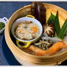 【冷凍庫&冷蔵庫の一掃料理。蒸篭蒸し】 今日は恒例の、でも不定期開催の冷凍庫&冷蔵庫のクリーンナップ日です! ・冷凍していたきのこと鮭の炊き込みご飯(レンジを持たないので蒸すしかない) ・冷蔵の厚揚げとオクラ、常温で数日放置していた茄子と生椎茸 ・冷凍していた秋鮭と、冷蔵の長ネギ、今日買ってきたしめじ 彩にパプリカ(赤色)など添えたかったけど、買って来なければならない。それでは冷蔵庫の掃除にならないので省略! 野菜や厚揚げは、ネギ&ぽん酢でいただきます😋