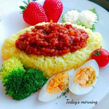 今朝の子供達のMorningプレート💖 ♡ミートソースライス♡ 今朝は冷凍ストックしてるミートソースを使って、カレーライスならぬミートソースライスな朝食に🤭 豚挽き肉、玉ねぎ、人参、茄子、トマト缶、ケチャップ、ソース、蜂蜜、クミンでじっくり煮込んだミートソース✨ターメリックライスでいただきます🍴🙏 今日は娘、受験直前対策で朝から塾の日曜講習📖 息子はまだ寝てるので、一足早く朝食💡 しっかり食べて今日も頑張れ👊😆🎵 さ、今日も楽しい1日にしよ〰️🎶