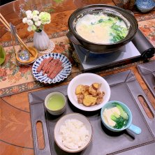 今日の晩ご飯は 湯豆腐😊 サツマイモと蓮根と豚肉の胡麻和え炒め ボローニャソーセージ こんばんは😊 今日は久しぶりにおうちごはん 野菜を入れるだけで 出来る湯豆腐の素と ボローニャソーセージは 贈りもので、友人たちからいただいたもの 私が忙しいので すぐに食卓に用意出来るものを 選んでくれたみたいで 感謝しかありません🥲 豆腐がすごく美味しかった(*´艸`)