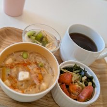 2025.11.18︎🌟昼ご飯︎🌟 ✰豆乳味噌スープ ✰ミニサラダ🥗(グリーンレタス・胡瓜・トマト🍅) ✰キウイリンゴ甘酒ヨーグルト🥝🍎 (蜂蜜🍯・リンゴ酢🍎) ⋆┈┈┈┈┈┈┈┈┈┈┈┈┈┈┈⋆ 最近葛切りにハマってる! 昨日までは味噌に葛切り入れて、今日からは豆乳味噌スープに葛切り入れた🤗 元々葛切りが大好き(*^ω^*) 葛切り茹でてクリーム系のパスタソースかけたらどうなんだろ❓🤔 このスープ無くなったら作ってみよ〰*(ˊᗜˋ*)و❤️