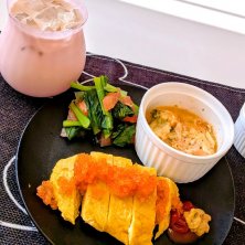 2026.2.5𖤐⋆早めの夜ご飯𖤐⋆ ♥︎︎卵焼き(とびっ子) ♥︎︎鮭グラタン残り ♥︎︎小松菜トマト🍅 ♥︎︎カルーワ🥃 ♥︎︎ᴴᴼᵀほうじ茶(サンファイバーAI) ⋆┈┈┈┈┈┈┈┈┈┈┈┈┈⋆ 卵焼きみたいなオムレツみたいな物が食べたくて作ったらこんな感じに! とびっ子のせてるのは特に意味はない🤣 とびっ子のプチプチが美味し~い‼️☺️ 小松菜トマト🍅は小松菜レンチンしてトマト🍅と和えたサラダ🥗的な物かな❓