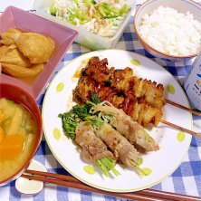 17日、月曜日の晩ごはん♪ ☆豆苗とエノキの豚肉巻き ☆焼き鳥皮(買ったもの) ☆7菜巾着がんもの炊いたん ☆カボチャとワカメの味噌汁 ☆蕪の漬物 月曜日、あまりリセットではない、ご飯(笑) 巾着がんもは、コープさんの商品で、 お揚げの中が、お野菜のがんもになってて美味しいψ(๑´ڡ`๑) 豆苗巻き、シャキシャキ感を残したかったけど、焼きすぎて、固くなっちゃって、一口で食べると、喉がつ、つまる〜(๐ ́꒪̐ꈊ͒꒪̐)ꐳ