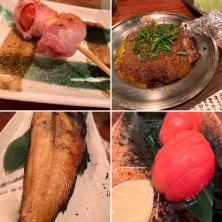 昨晩の居酒屋メシ(^^) 冷やしトマト、骨付き鶏焼き、ホッケ焼き、ミニトマトベーコン巻串、とお酒のススム肴達でした^ - ^