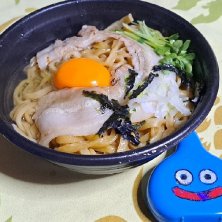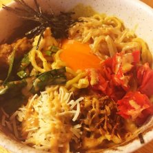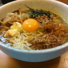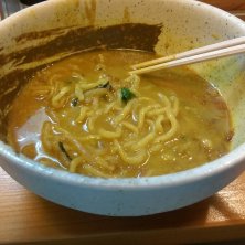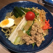 小籠包だし入りカレー混ぜそば。 トッピングの紅しょうがor福神漬けを福神漬けに。 「半分食べたら、スープ入れますから」で半分食べて待ちました。 味は美味しいよ。 ただ、暑いから冷し中華にしたかった。