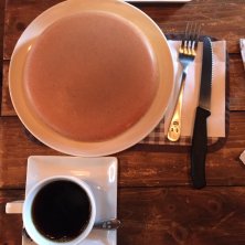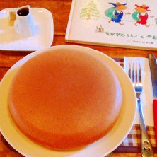 大きな大きなパンケーキ、コーヒー@絵本カフェholoholo 『グンモーニン!』を置かせていただく。あぁ…晴れているヽ(´o`隣の隣のご婦人たちが王子のムッシュムシパンの話をしている。