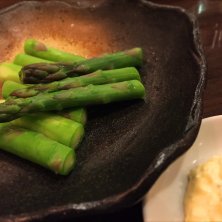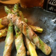 アスパラの豚バラ巻きを、黒ホッピーで頂くよ。もう、春のメニューなんだなあ。(*´ω`*)