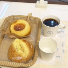 イベリコ豚ベーコン&チーズのカンパーニュとバスクチーズケーキ風パンにホットコーヒーとレモン水😋