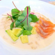 サーモンとアボカドのクリームうどん(๑•ᴗ•๑)♡ やっぱ武蔵小杉の乗り換えは寄り道しちゃう(*^^*) 東急スクエアで創作うどんのお店で休憩! これ、冷たいかと思ってたけど、熱くて美味しい*\(^o^)/* スープ、粉チーズかけてみんな飲んじゃった(*^^*)