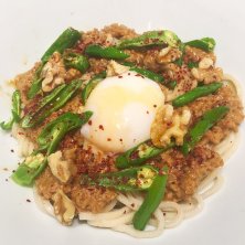 冷やし坦々うどん❤️ 夏は冷たい麺が異常に食べたくなる〜✨ 肉味噌が麺とよ〜く絡んで美味しい!!! 半熟卵でマイルドに食べれて、クルミがいい感じのアクセントになっています。 ただ、ししとうが多過ぎて辛すぎた…