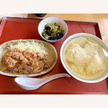 2025年9月11日 ランチ 白米+冷だし+わさび 生姜焼き わかめの酢の物 紗奈と孫ちゃん3人と6人で初飯綱へ
