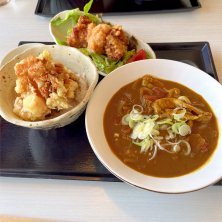 休日のランチ! ミニカレーうどん ミニかき揚げ丼 ぽん酢 唐揚げ