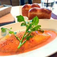 オマール海老とトマトクリームのオムレツ 自家製パン付き lunch¥1500 パンはふわふわでバターたっぷり! 焼きたて?熱々で感動。 もちろんオムレツもトロトロで美味しかったけど、パンが美味しすぎて夢中でした。