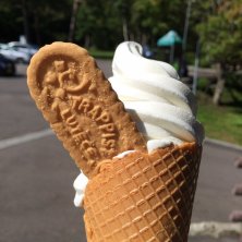 トラピスト修道院のソフトクリーム。 コーンにもトラピストバターを使ってるんだって。 行ってよかった場所今回のNo. 1! のんびり散策してたら、パトカーが巡回しててこう言いました。 「今日はクマの痕跡見なかったか?」 「…って、どんなのですか??(ミタコトナイシ!)」 「ここはクマの巣穴あるからね〜気をつけてね〜!」サーッと退場。 「! え〜、今更!…まぁ、帰り道に聞いて良かった…?(笑)」 その後の帰り道の足取りは、とっても早かったですよ…(笑)