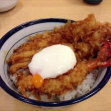 今日の夕食は、ジムの後にてんやで。 ・大江戸天丼 半熟玉子付き 海老とイカと穴子です。