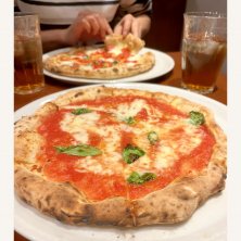 マリータで。 一番シンプルな、トマトソース・ニンニク・オレガノだけのマリナータ。 釜で焼きたての熱々をほうばる。 隣の年配のご夫婦が「本場のピザは三角縁神獣鏡みたいやな」って言ってたのがツボ。