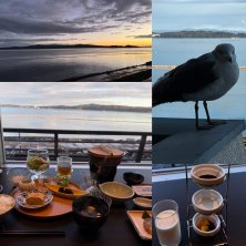 朝食食べてたらカモメが来てプレッシャーをかけてきた。窓開かないんで。朝日が綺麗でした。
