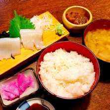 三ノ輪で老夫婦が営む釜飯 定食店で スルメイカ刺身定食780円 小鉢の煮物がばあちゃんの味 いいなぁ〜