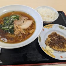 醤油ラーメンとアジフライとちょい飯で590円なり。