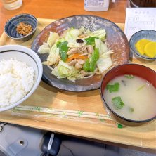 今日もお昼は万福。肉野菜炒め定食ご飯少なめ 野菜たくさん摂れて安心!
