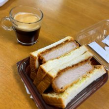 大好きなまい泉三元豚の厚切りロースカツサンド420円。と、ネスプレッソ。早めのランチ的なもの。きっと美味い!