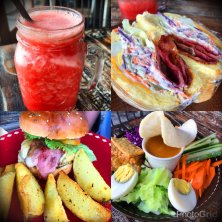 こんにちは◝(⑅•ᴗ•⑅)◜..°♡ ランチ。 スイカとイチゴとライムのジュース コールスローと目玉焼きとベーコンのサンドイッチ チーズハンバーガー ガドガド お野菜たっぷり摂らなきゃね。