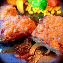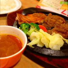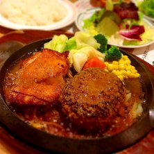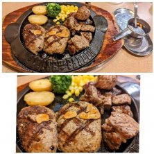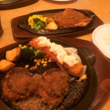 ハンバーグとサーロインステーキのフライングコンボ注文してみました!ボリューム満点でジュージューいいながら出てきた!はねるから紙を当ててガード!もうお腹いっぱいです(≧∇≦)