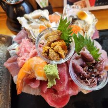 大将 おまかせ丼 穴子のせ : 1.さざえ刺し,2.穴子,3.とろサーモン,4.つぶ貝,そして北海産生うに の中から1つ選んで注文(^-^)/ 生うにだけ値段が上がります(^-^) 身体も声も大きい大将にお任せするので、出てくる丼も豪快╰(*´︶`*)╯♡ これでもご飯は少なめでお願いしました٩( ᐛ )و この他に小鉢と冷製茶碗蒸しと汁もの付き^ - ^ 食べ応え充分ε-(´∀`; ) 美味しかった〜(*^^*)