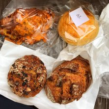 直食が食べたい…!もうそれしか考えられずこんな湿気の中を涼しいとはいえ小1時間歩いたら汗だくになるよなー汗だくのオバはんなんてパン屋のおねーさんもドン引きだよなーああ自転車に乗れたら!(乗れないのです) 🚃だから電車で。ってそれが普通🤣 いろんな粉を使う直食、今はキタノカオリ 美味しそうすぎて2つ買っちゃった❣️ 後:直食×2 前:全粒粉のスコーン×2 ハードトースト 豆乳と黒糖 山食 ああ…っ! ミルクフランス買うの忘れたぁ😢