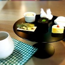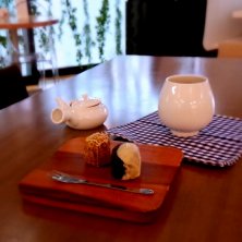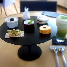 新幹線待ち休憩 五種類のスィーツと抹茶ラテ ドゥーブルネージュ、最中のフロランタン、チーズケーキ、ブラウニー、杏仁豆腐、みじん切り茹で卵のマスタード和えピクルス添え チョコチョコ楽しめます♪