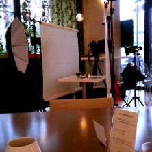 おまけ 目の前にはこんな光景が♪ 光源が複雑(+o+) 後ろのPCですぐさまチェックしてます。カメラマン一人、アシスタント二人ですが、カメラマンがキッチンで出来上がったばかりのフードを手で抱えてテーブルに運んでましたね♪