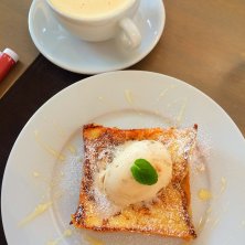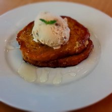 鹿児島出張の日のお楽しみ ゴルゴンゾーラのフレンチトースト ゴルゴンゾーラが熱々フレンチトーストに挟んで有ります(*^^*) 上にはナッツのアイスクリーム♪ 熱々⇔冷たい 甘い⇔塩っぱい あっと言う間に無くなりました(笑)