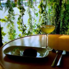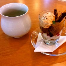 ちょっと休憩 老舗お茶屋さんの和パフェと緑茶♪ 和テイストな大学芋やグラノーラなど色んな食感が楽しい美味しいパフェでした。 ワイングラスの様な茶器は有田焼、しっとりと収まりが良く香りも楽しめます♪