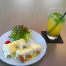 ちょっと休憩 フランスのコンテチーズを使ったクロックムッシュ(^^) ホワイトソースが入っている?と思うくらいミルク感たっぷりの美味しいチーズです(^^) ミント緑茶ソーダと共に♪