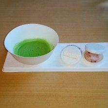 鹿児島出張の日のお茶 お抹茶とかるかん♡ 和紙の器で出てきました(^^) かるかんが最中の中に入っていますが、バリッとモチッとと色んな食感が楽しめて、これはお薦めです♡