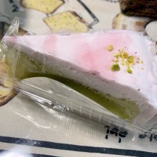 苺とピスタチオのシフォン🍰 息子が仕事帰りにAEONで買って来てくれた100円ケーキ。 失礼ながら、そう期待はしていなかったのですが… コレは「お値段以上」でした。 いわゆるジェノワーズもしっとりしていて、ちゃんとピスタチオが味わえました。表示にも『ピスタチオ』と書いてあり、紛い物⁈ではなさそう。添加物もそれなりですが。 息子曰く『安物のケーキやから、クリームが固くて自転車でも買って帰れた』そう。 お皿にも入れず、写真もいつも以上に適当で扱いも雑ですが記録用に。